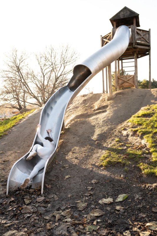Ein Schiff, ein Schloss, ein Auto und ein Pferd. Als Kinder finden wir auf dem Spielplatz eine kleine Welt vor. Gebaut zum bloßen Vergnügen, für körperliche Ertüchtigung und als Bühnenbild für blühende Fantasien, treten die Spielplatz-Bauten in melancholic ground jenseits ihrer gewohnten Funktionen auf. Auf dem wippenden Pferd und der Rutsche agieren 14 Performer:innen verschiedener Generationen, sie vollziehen ihre Bewegungen in extremer Langsamkeit, in stockendem Fluss oder bieten, plüschkostümiert, sich selbst zum Spielzeug für die anderen an.
